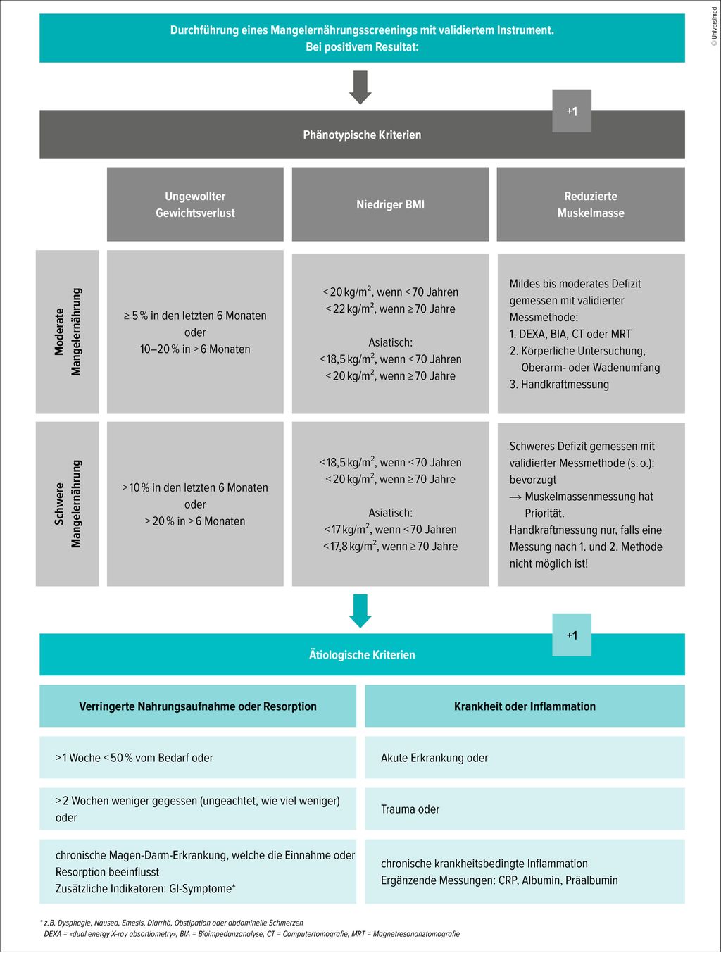 Neben Adipositas, Ödemen, Arteriosklerose, Niereninsuffizienz, bestimmten Arzneimitteln etc. gilt eine Mangelernährung als wichtiger Faktor für eine verzögerte Wundheilung bzw. Wundheilungsstörung. Zur Definition sollten die «Global Leadership Initiative on Malnutrition»(GLIM)-Kriterien herangezogen werden. Für das Vorliegen einer Mangelernährung müssen ein phänotypisches und ein ätiologisches Kriterium erfüllt sein (Abb.1).2