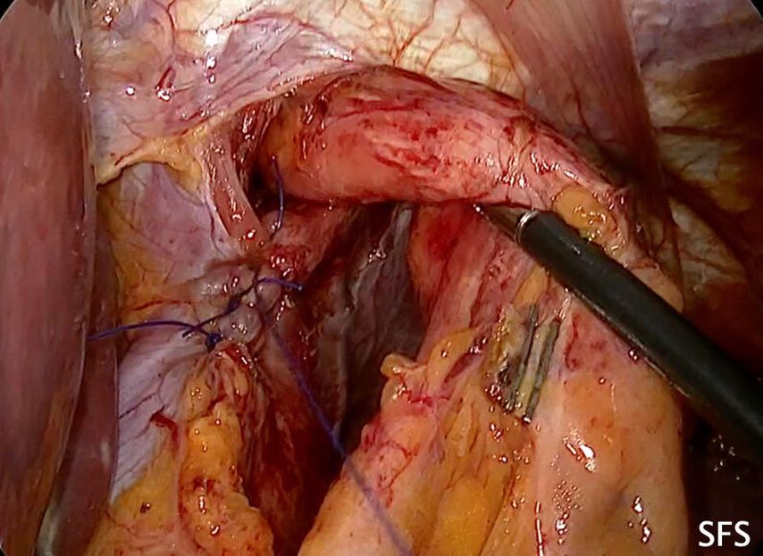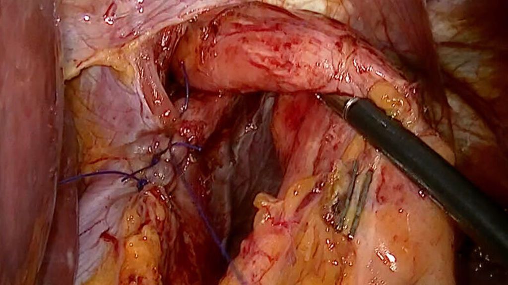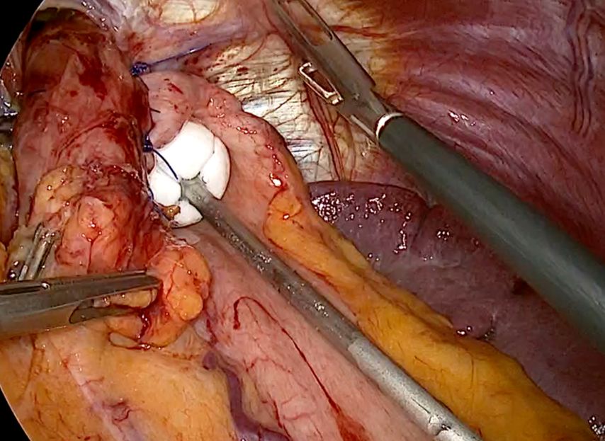 Abb. 1: Operationssitus nach Mobilisation des Ösophagus in den Bauchraum und Verschluss der Zwerchfellhernie (Rekonstruktion des diaphragmalen Sphinkters)
