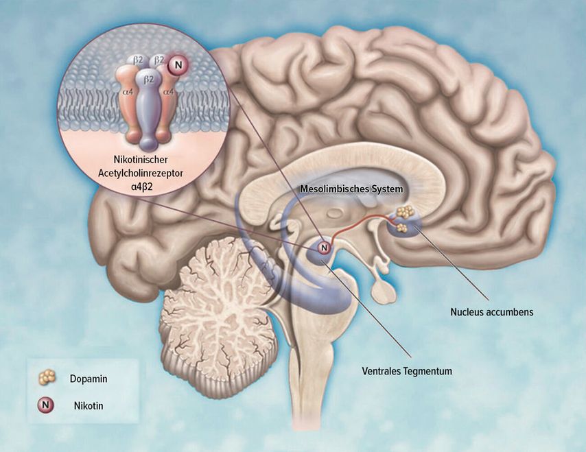 Das im Tabak enthaltene Alkaloid Nikotin ist ein sehr starker Suchtstoff, vergleichbar mit Heroin und Kokain. Durch seine Ähnlichkeit zu Acetylcholin bindet es an den α4β2-Acetylcholinrezeptor im Tegmentum und führt zu einer Dopaminfreisetzung im Nucleus acumbens (Belohnungssystem) (Abb. 1).7 Ein Absinken des Nikotinspiegels führt zu Rauchverlangen («Craving») und Entzugssymptomen. Durch Beifügen von Zusatzstoffen wird die Nikotinaufnahme in den Alveolen beschleunigt, sodass dieses innert Sekunden im zentralen Nervensystem anflutet.8