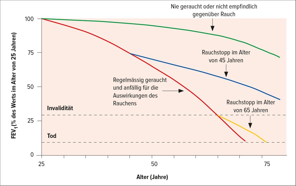 Der inhalierte Zigarettenrauch beschleunigt den Verlust der Lungenfunktion und führt somit zur COPD. Fletcher und Peto konnten bereits 1977 zeigen, dass ein Rauchstopp diesen beschleunigten Abfall aufhalten kann9 (Abb. 2). Dieser Zusammenhang kann in der Rauchstopp-Beratung als Motivation zum Rauchstopp verwendet werden: «Je früher, desto besser – lieber spät als nie!» Nikotin und weitere Bestandteile des Zigarettenrauchs führen zu einer Endotheldysfunktion, Vasokonstriktion, Gerinnungsaktivierung und begünstigen somit eine arterielle Hypertonie, Vaso-/Koronarsklerose und Ischämien. Rauchende (ab 20 Zigaretten/Tag) haben ein 4-fach erhöhtes Herzinfarktrisiko im Vergleich zu Nichtrauchenden.6 Das perioperative Risiko ist erhöht: Nikotin steigert die Stressantwort (Tachykardie, Hypertonie, Vasokonstriktion), CO ist proarrhythmogen und verringert das O2-Angebot im Gewebe. Die Wundheilung ist verzögert und die Infektanfälligkeit erhöht. Zudem haben Rauchende oft Vorerkrankungen (COPD, Hypertonie, koronare Herzkrankheit), welche das Operationsrisiko weiter erhöhen.11