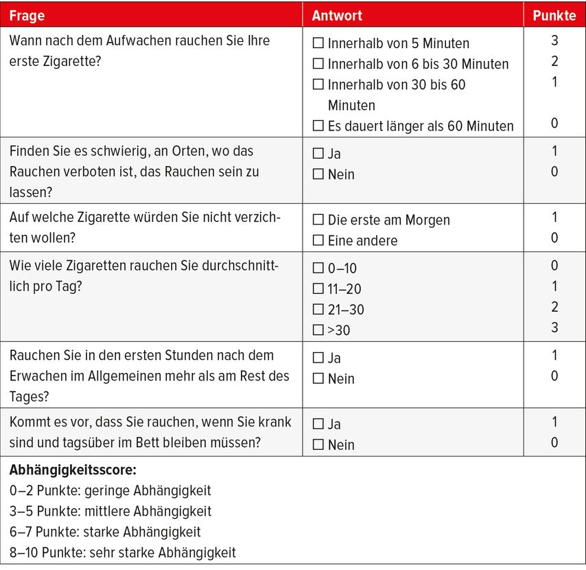 Der Schweregrad der Nikotinabhängigkeit kann mit dem Fagerström-Test für Nikotinabhängigkeit erhoben werden (Tab. 1).13,14 Wichtigste Faktoren für eine schwere Abhängigkeit sind die Anzahl gerauchter Zigaretten (>15/Tag) und das Zeitintervall zwischen dem Aufstehen am Morgen bis zum Rauchen der ersten Zigarette (innerhalb von 30 Minuten). Bei schwerer Nikotinabhängigkeit macht eine medikamentöse Unterstützung Sinn. Hierfür eignen sich Nikotinersatzpräparate sehr gut. Empfohlen wird eine Anwendung in Anlehnung an das «Basis-Bolus-Prinzip». Ein transdermales Pflaster (in drei Konzentrationen erhältlich) gibt Nikotin über 16 bzw. 24 Stunden ab. Es gibt verschiedene kurz wirksame Präparate, welche helfen, das «Craving» zu überbrücken: Lutschtabletten, Sublingualtabletten, Mundspray. Die Anwendung eines Nikotinkaudepots erfordert die Instruktion der korrekten Technik («chew and park»). Ein Nikotininhalator (nikotingetränkte Patrone) kann die Gestik unterstützen, er soll «gepafft» werden. Das Nikotin in diesen Ersatzpräparaten, welche alle frei verkäuflich sind, wird über die Haut bzw. Schleimhaut aufgenommen, es wirkt deshalb weniger schnell als inhaliertes Nikotin und bewirkt somit keinen «Sucht-Kick». Wichtig sind eine genügend hohe Dosierung und eine genügend lange Einnahme und ein Ausschleichen über mehrere Wochen. Massgebend für die Dosierung und Einnahmedauer ist das Verlangen nach Zigaretten.3