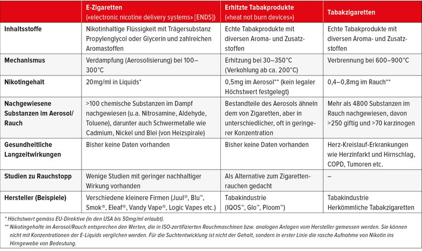 Hier gilt es zu unterscheiden zwischen den sogenannten «electronic nicotin delivery systems» (ENDS, E-Zigaretten) und den erhitzbaren Tabakprodukten. Bei beiden wird ein Aerosol produziert, welches inhaliert wird. Tabelle 222 gibt eine Übersicht über Inhaltsstoffe, Wirkmechanismus, Nikotingehalt, nachgewiesene Substanzen und gesundheitliche Folgen.