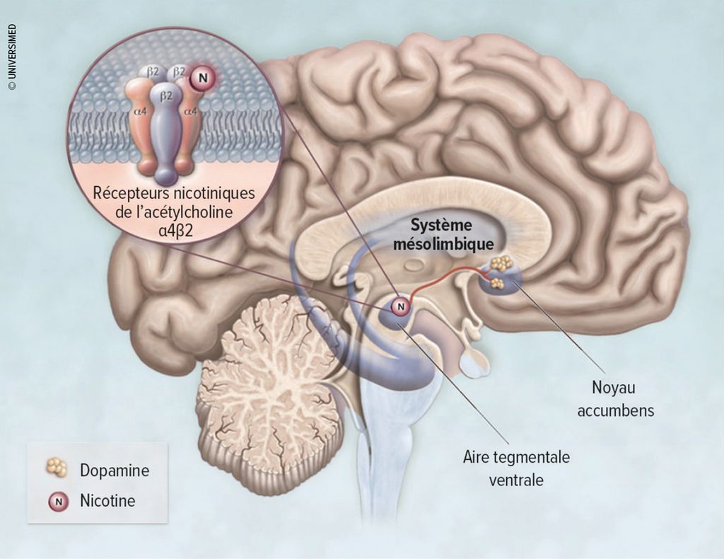 La nicotine, un alcaloïde contenu dans le tabac, est une substance addictive très puissante, comparable à l’héroïne et à la cocaïne. En raison de sa similitude avec l’acétylcholine, elle se lie aux récepteurs nicotiniques de l’acétylcholine de type α4β2 dans l’aire tegmentale ventrale et entraîne une libération de dopamine dans le noyau accumbens (système de récompense) (Fig. 1).7 Une baisse du taux de nicotine entraîne un désir de fumer («craving») et des symptômes de sevrage. L’ajout d’additifs accélère l’absorption de la nicotine dans les alvéoles, de sorte qu’elle afflue en quelques secondes dans le système nerveux central.8