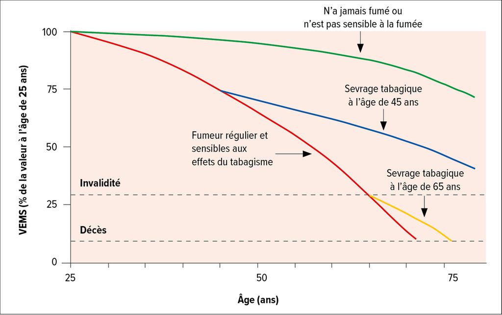 Fig. 2: La «courbe de Fletcher» montre l’évolution naturelle de l’obstruction chronique des voies respiratoires en fonction du statut tabagique (adapté selon Kotz D et al. 2007)10