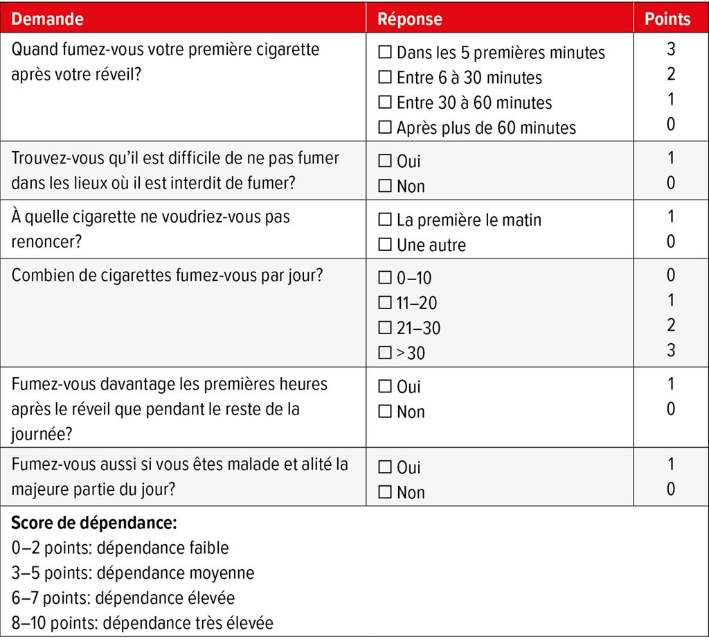 Le degré de sévérité de la dépendance à la nicotine peut être évalué à l’aide du test de Fagerström pour la dépendance à la nicotine (Tab. 1).13,14 Les facteurs les plus importants pour une dépendance sévère sont le nombre de cigarettes fumées (>15/j) et l’intervalle de temps entre le lever le matin et le moment où la première cigarette est fumée (dans les 30 minutes). En cas de dépendance sévère à la nicotine, un traitement de support médicamenteux est judicieux: les substituts nicotiniques conviennent très bien à cet effet. Il est recommandé d’appliquer le «schéma basal-bolus». Un dispositif transdermique (disponible en trois concentrations) délivre de la nicotine pendant 16 ou 24 heures. Il existe différentes préparations à courte durée d’action qui aident à surmonter le «craving»: comprimés à sucer, comprimés sublinguaux, solution pour pulvérisation buccale. L’utilisation de pastilles dépôt à mâcher nécessite l’instruction de la technique correcte («chew and park»). Un inhalateur de nicotine (cartouche imprégnée de nicotine) permet de garder le geste, car il doit être «fumé». La nicotine contenue dans ces substituts, qui sont tous en vente libre, est absorbée par la peau ou les muqueuses, elle agit donc moins rapidement que la nicotine inhalée et ne provoque pas de «kicks». Il est important d’utiliser un dosage suffisamment élevé, de prendre le médicament pendant une durée suffisamment longue et de réduire la dose progressivement sur plusieurs semaines. C’est l’envie de fumer qui est déterminante pour le dosage et la durée de la prise.3