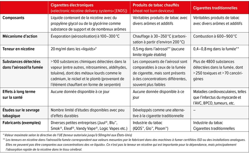 Il convient de faire la distinction entre ce que l’on appelle les «electronic nicotin delivery systems» (ENDS, cigarettes électroniques) et les produits de tabac chauffés. Dans les deux cas, un aérosol se forme et est inhalé. Le Tableau 222 donne un aperçu des composants, du mécanisme d’action, de la teneur en nicotine, des substances détectées et des effets sur la santé.