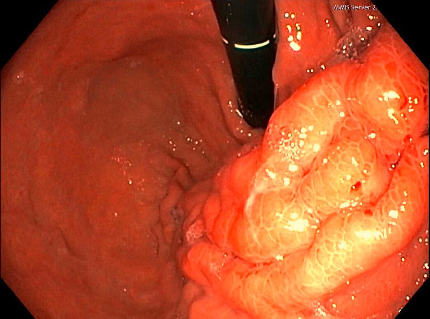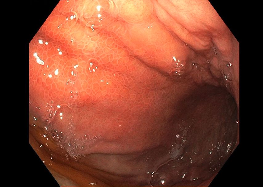 Eine Gastroskopie unter Intubationsnarkose wird angeschlossen (Abb.2). Gastroskopisch ist der Magen leer, die Schleimhaut adäquat durchblutet, ohne Ulzerationen oder malignomsuspekte Areale. Die einzige Auffälligkeit: Der Magen entfaltet sich nicht gänzlich, und zwar aufgrund einer submukös liegenden, verdrängenden Raumforderung im Bereich der Magenvorderwand. Aufgrund der Raumforderung kann der Pylorus nicht eingesehen werden.