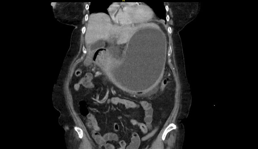 In der durchgeführten Computertomografie des Abdomens (Abb.1) zeigt sich der Verdacht auf einen hohen Ileus mit prall sekretgefülltem, distendiertem Magen (25cm kraniokaudal). Weiters stellt sich die Magenwand auf bis zu 17mm verdickt dar – mit intramuralen Lufteinschlüssen, insbesondere entlang der großen Kurvatur. Eine Ausgangsstenose im gastroduodenalen Übergang wird suspiziert. Rasch wird eine nasogastrale Sonde eingebracht, die trotz korrekter Lage kein Sekret fördert.