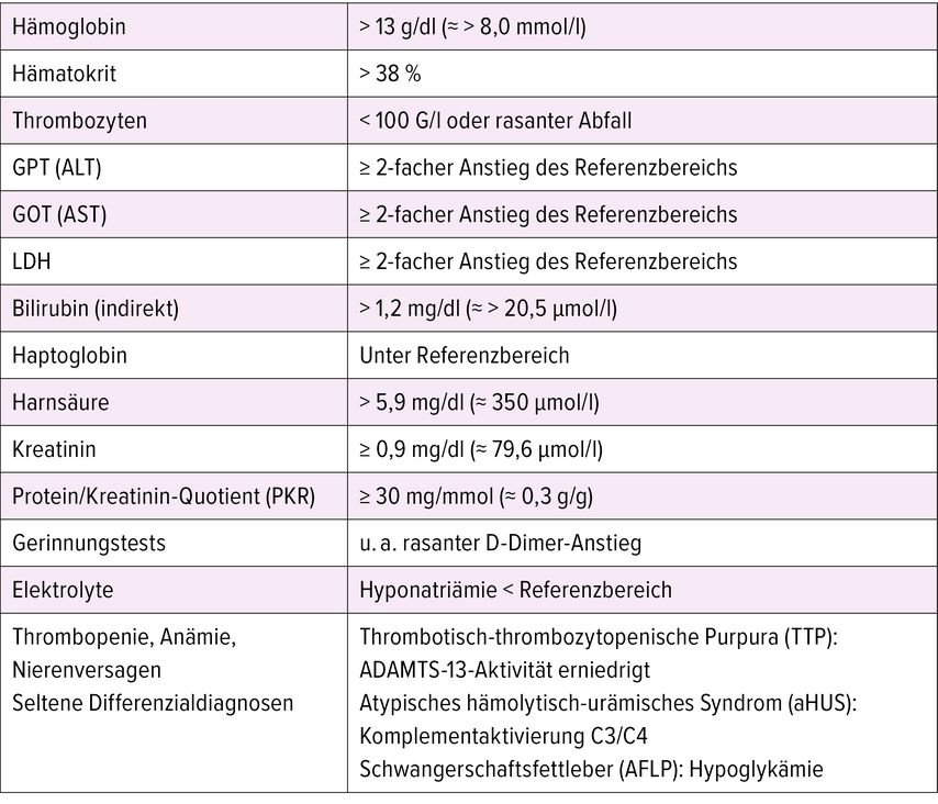 Bei ≥1 Proteinurie + im Urinstix soll der Protein-Kreatinin-Quotient bestimmt werden; ein Wert ≥30mg/mmol (300mg/g) gilt als auffällig und eine 24-h-Sammelurinbestimmung ist nicht nötig. Bei Verdacht auf Präeklampsie – insbesondere bei Symptomen wie Oberbauch- oder retrosternalen Schmerzen – sollten typische Laborveränderungen und ein HELLP-Syndrom (Hämolyse, erhöhte Leberwerte, Thrombopenie) abgeklärt werden, die Parameter sind in Tabelle 1 aufgeführt.