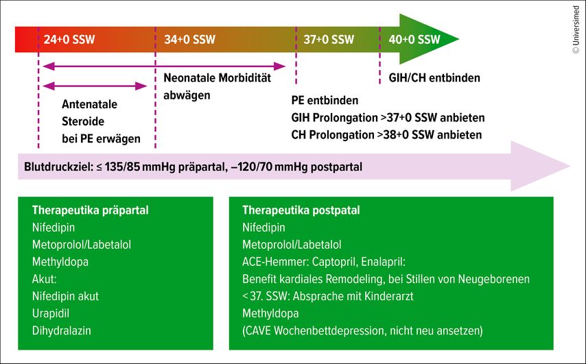 Nach 37 Schwangerschaftswochen bietet die Prolongation bei manifester Präeklampsie keine Vorteile mehr und die Entbindung sollte per Einleitung oder Kaiserschnitt angestrebt werden.7 Im Gegensatz dazu ist eine Schwangerschaftsprolongation bei gut eingestellter chronischer Hypertonie (CH) oder Gestationshypertonie (GIH) neuerdings nach den 2024 publizieren Leitlinien auch bis zum errechneten Geburtstermin vertretbar.7