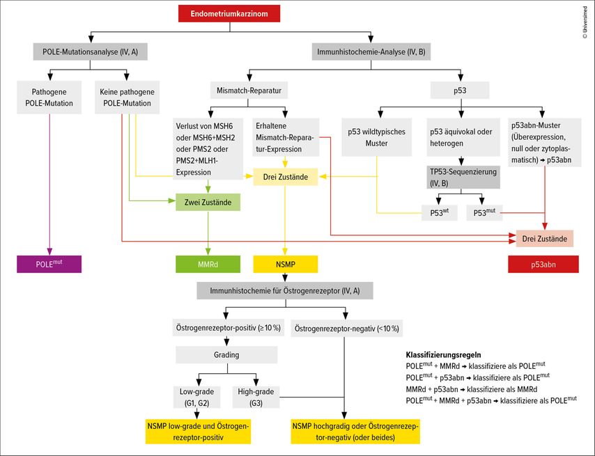Die ESGO/ESTRO/ESP-Leitlinie unterstreicht einmal mehr, dass das Endometriumkarzinom keine homogene Entität darstellt, sondern dass sich hinter dem Terminus Endometriumkarzinom unterschiedliche Erkrankungen befinden. Man unterscheidetmittlerweile fünf molekulare Subtypen. Die fünf molekularen Subtypen sind entscheidend für die Prognose und Therapieentscheidungen: POLE-mutierte Tumorgruppe (POLEmut), Mismatch-Repair-defiziente Tumorgruppe (MMRd), p53-abnorme Tumorgruppe (p53abn), NSMP-Tumorgruppe („no specific molecular profile“). Die NSMP-Tumorgruppe wird nun in zwei Subgruppen, eine Low-Grade- UND Östrogenrezeptor-exprimierende Subgruppe und in eine High-Grade- und/oder Östrogenrezeptor-negative Gruppe unterteilt (Abb. 1). Die molekularpathologische Klassifikation fließt systematisch in die Risikogruppen und – über die FIGO-Klassifikation – sogar in die Stadienbenennung ein (z.B. Stadium IAm POLEmut, IICm p53abn).