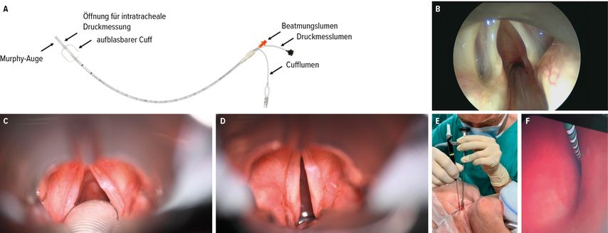 Abb. 2A–F: A: Tritube® (OD 4,4mm, ID 2,3mm); B: Trachealstenose mit Tritube®; C: konventionelle Intubation (Tubus 6,0 ID); D: im Vergleich eine Tritube®-Intubation (ID 2,3mm); E: Abtragung eines subglottischen Granulationsgewebes unter kontinuierlicher FCV®-Beatmung durch OA Dr. Andreas Strobl; F: fiberoptische Atemwegsschienung mittels Guidewire