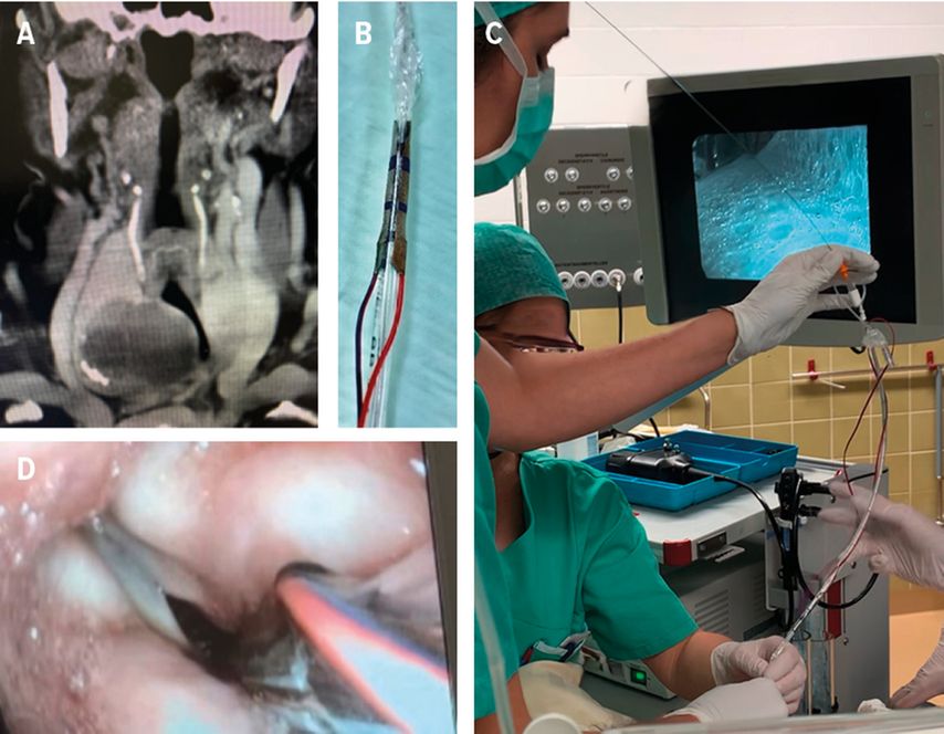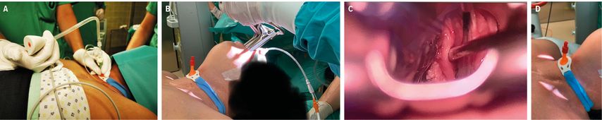 Abb. 4A–D: A: hochgradige Trachealstenose; B: Tritube® mit modifizierten Klebeelektroden; C: Vorschieben des Tritubes® über den Guidewire bei wachem Patienten; D: gesicherter Atemweg, Klebeelektroden auf Stimmbandebene