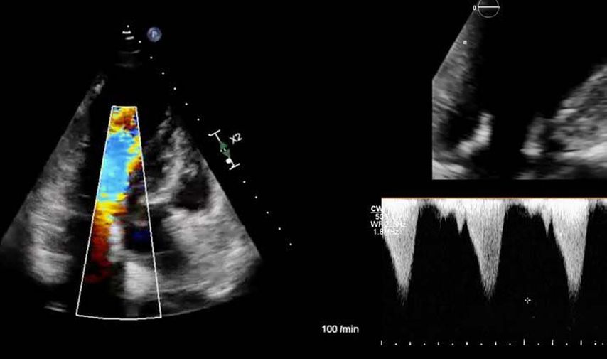 Der erste Fall beschäftigt sich mit einem Patienten mit einer hypertrophen Kardiomyopathie (HCMP). Er gibt eine deutliche Belastungsdyspnoe sowie einen ausgeprägten Leistungsknick an. Es wurde infolgedessen eine Untersuchung mittels standardisierter Echokardiografie inklusive „strain imaging“ durchgeführt. Der globale longitudinale „strain“ (GLS) mit –16% in Ruhe war gering reduziert. Es konnte kein relevanter LVOT-Gradient in Ruhe nachgewiesen werden. In der Belastungssituation (Handgrip, Valsalva, Kniebeugen und als Vorbereitung zur Untersuchung ein ausgiebiges Frühstück und Kaffee sowie ein am Vorabend konsumiertes Bier) konnte bei Kniebeugen mit einer Herzfrequenz von 126/min ein Spitzengradient bis 52mmHg dargestellt werden. Somit ergibt sich die Diagnose einer HOCMP mit einem belastungsinduzierten Gradienten. Bei bereits bestehender und ausgereizter Therapie unter Betablocker besteht die Indikation zur Therapie mittels des kardialen Myosininhibitors Mavacamten (Klasse-IIa-Empfehlung laut ESC).1 Darunter verbesserte sich die klinische Situation des Patienten deutlich, der Patient konnte uneingeschränkt Sport ausüben. Über die Zeit kam es zu einer geringen Reduktion der LV-Masse und einer geringen Zunahme des LV-„strain“. Die Belastungssituation zeigte durchwegs normale „strain“-Werte mit –20% (mit regionaler Reduktion bei Myokardwandverdickung im Sinne einer Hypertrophie). Die myokardiale Arbeit beim konkreten Patientenfall ist ebenso in Ruhe im grenzwertigen und unter Belastung im guten Normalbereich.6,8,9 Der Patient ist derzeit unter 5mg Mavacamten einmal täglich optimal eingestellt. Die EF in Ruhe ist konstant bei 50–55%. In Video 2 werden unterschiedliche Gradienten dargestellt, um eine HOCMP mit LVOTO von z.B. einer Mitralklappeninsuffizienz zu unterscheiden.Die Verdachtsdiagnose wurde mithilfe der Echokardiografie gestellt und durch das septal betonte „patchy“ LGE im MRT bestätigt.1,5