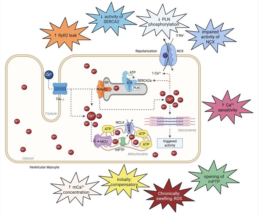 Die HFrEF ist durch eine gestörte Erregungs- und Kontraktionskopplung gekennzeichnet, wobei insbesondere eine verminderte Dichte und Desorganisation der T-Tubuli zu einer abgeschwächten und asynchronen Ca2+-Freisetzung führen. Dies resultiert in reduzierten Ca2+-Ionen und beeinträchtigter Kontraktilität der Kardiomyozyten. Zusätzlich sind die Expression und die Funktion des L-Typ-Ca2+-Kanals (LTCC) herabgesetzt, was die Ca2+-Einstromdynamik weiter verschlechtert.11 Bei HFrEF kann die Wiederaufnahme von Ca2+ in das sarkoplasmatische Retikulum (SR) durch eine reduzierte Aktivität der SR-Kalzium-ATPase2a (SERCA2a) und eineHypophosphorylierung von Phospholamban eingeschränkt sein, was die diastolische Ca2+-Clearance limitiert. Dies ist allerdings nicht die primäre Abnormalität der HFrEF. Gleichzeitig ist der Ryanodinrezeptor2 (RyR2) am SR häufig hyperphosphoryliert und oxidiert, was zu einer erhöhten, unkontrollierten Ca2+-Freisetzung („leaky RyR2“) und damit zu einem Ca2+-Verlust aus dem SR und folglich zur erhöhten Arrhythmieanfälligkeit führt. Die Aktivität des Natrium-Ca2+-Austauschers (NCX) ist bei HFrEF oft gesteigert, wodurch vermehrt Ca2+ aus der Zelle entfernt wird und das SR-Ca2+-Reservoir weiter abnimmt. Dies trägt zu einer weiteren Schwächung der systolischen und diastolischen Funktion sowie zur Arrhythmogenese bei. Darüber hinaus ist die mitochondriale Funktion bei HFrEF beeinträchtigt: Die Ca2+-Aufnahme in die Mitochondrien ist reduziert, was die ATP-Produktion limitiert und oxidativen Stress fördert. Insgesamt resultieren diese Veränderungen in einer Sarkomerdysfunktion, verminderter Kontraktilität und maladaptivem kardialem Remodeling, einschließlich Fibrose.10