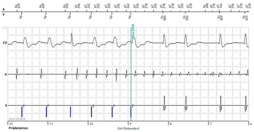 Abb. 1: Intrakardiale EKG-Aufzeichnung des Beginns einer AHRE mithilfe des 2-Kammer-AICD (automatischer implantierbarer Kardioverterdefibrillator)Rivacor 7 DR-T der Fa. Biotronik