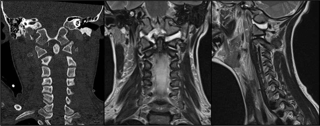 Abb. 1: CT und MRT eines pädiatrischen Patienten mit einer Typ-I-AOD und atlantoaxialer Dislokation nach Verkehrsunfall