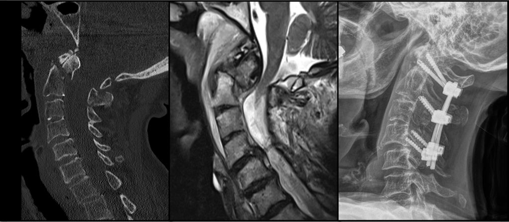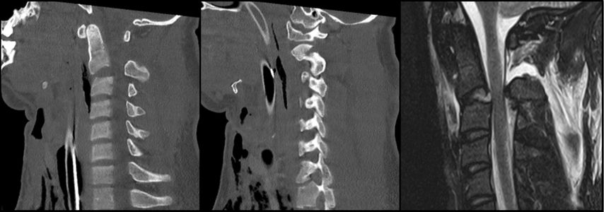Abb. 2: CT, MRT und Versorgungsstrategie bei einer stark dislozierten Densfraktur Typ IIb mit begleitender Atlasbogenfraktur bei einer geriatrischen Patientin