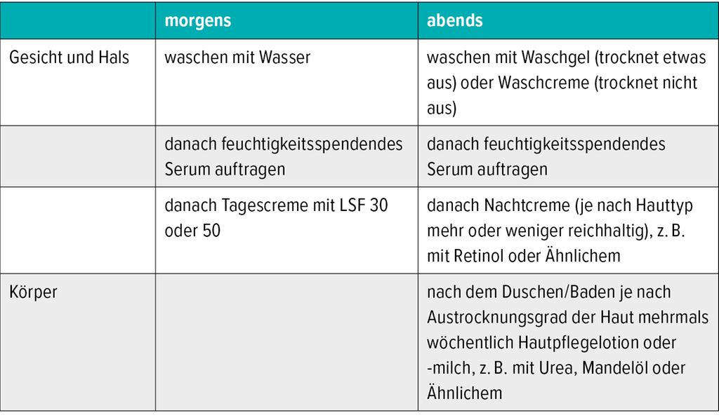 Je nach Hauttyp in Bezug auf die Pigmentierung, aber auch auf die Talgproduktion sind dermatologisch getestete Hautpflegeprodukte auf dem Markt, die für alle gesundheitsbewussten Patient:innen geeignet sind. Dazu gehören für das Gesicht Reinigungsgels oder Waschcremen, feuchtigkeitsspendende Seren, Tagespflegeprodukte mit hohem UV-Filter und für die Nacht je nach Bedarf mehr oder weniger reichhaltige oder hautbildklärende Cremen (Tab.1). Die gewissenhafte Pflege der Haut am ganzen Körper sollte nicht in Vergessenheit geraten, denn jeder Wasserkontakt saugt Fette aus der Haut, die möglicherweise – vor allem mit zunehmendem Alter – nicht in ausreichender Menge nachgebildet werden. Deshalb ist je nach Austrocknung der Haut die rückfettende Pflege mit geeigneten Hautpflegelotionen mehrmals wöchentlich zur Prophylaxe der Xerosis cutis empfehlenswert (und das gilt auch für Männer!).