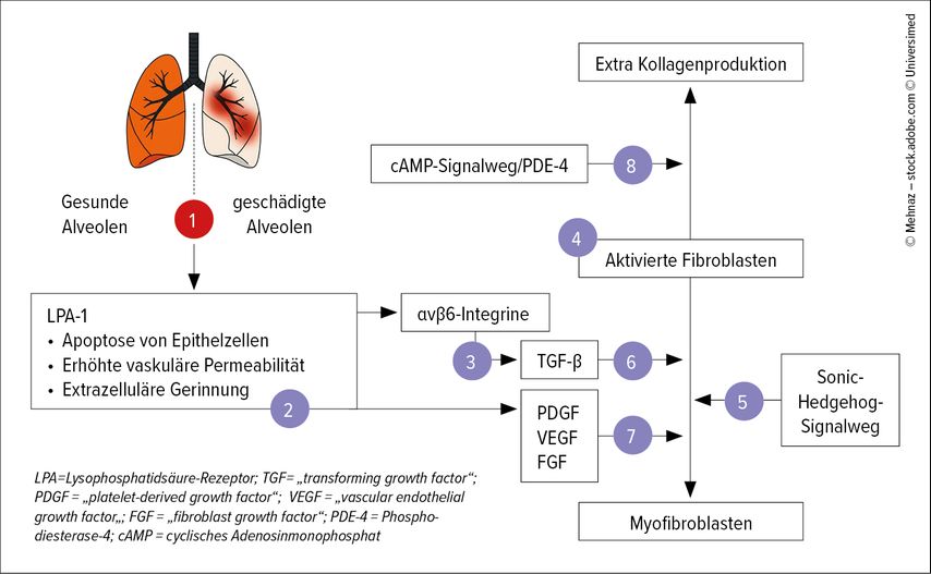Singh erläuterte die Entstehung von IPF und PPF (Abb.1): Gesunde Alveolen werden durch verschiedene Einflüsse geschädigt (Genetik, Autoimmunität, Viren, Bakterien, Umweltantigene), die den Lysophosphatidsäure-Rezeptor 1 (LPA1-Rezeptor) aktivieren, was zu Apoptose, verstärkter Gefäßpermeabilität und Koagulation im Extrazellulärraum führt und wiederum Integrin αvβ und den transformierenden Wachstumsfaktor TGF-β sowie weitere Signalwege aktiviert. Diese Mechanismen bewirken, dass aktivierte Fibroblasten in Myofibroblasten umgewandelt werden. Zudem existiert der Sonic-Hedgehog(Shh)-Signalweg, der die Fibroblasten aktiviert. Die aktivierten Fibroblasten lagern auch vermehrt Kollagen ab, und zwar über den Phosphodiesterase-4(PDE-4)-Signalweg.